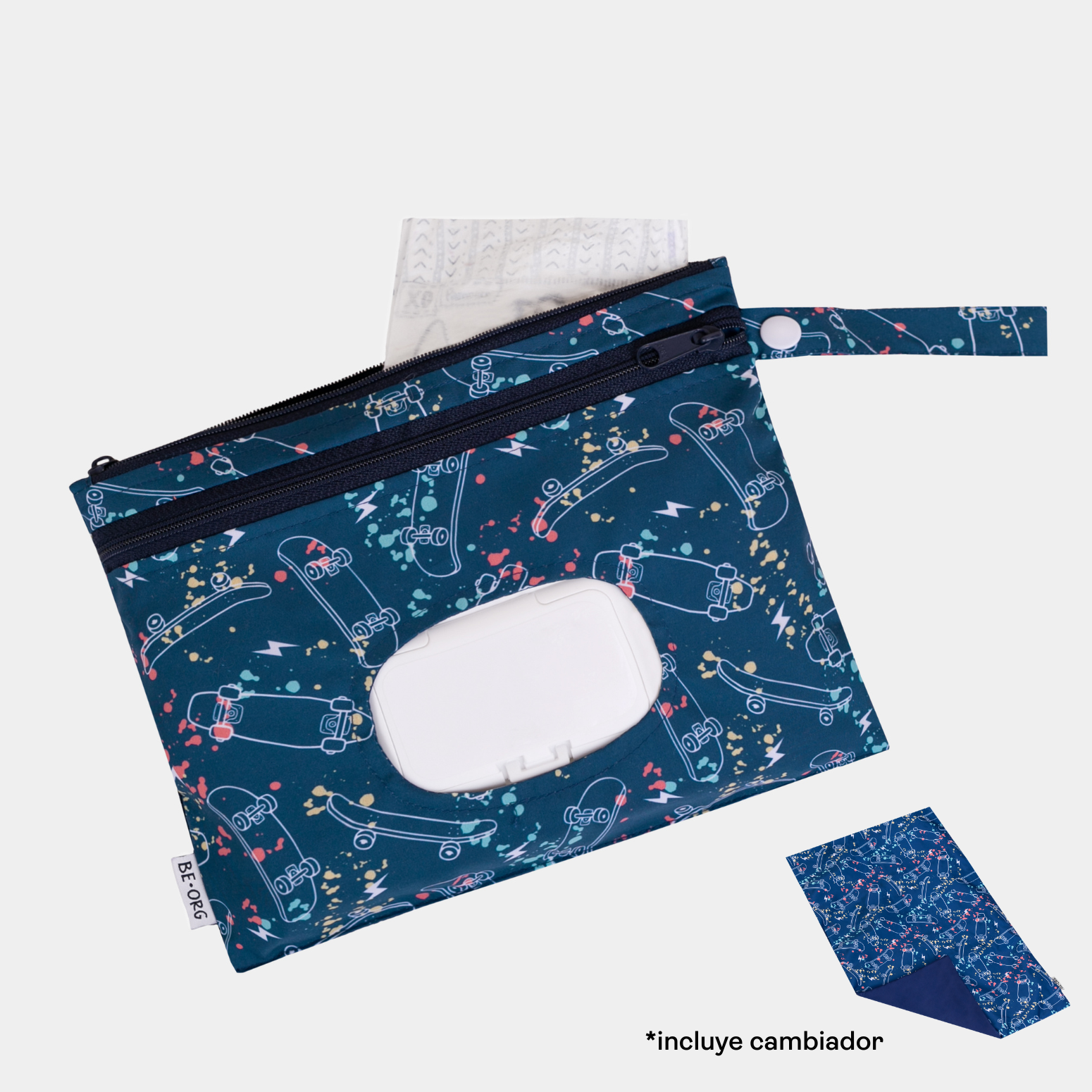 Con 3 compartimientos que te permiten transportar 3 pañales, cremita, paquete completo de wipes con acceso directo y ahora incluye un práctico cambiador impermeable para sacarte de apuros en cualquier lugar.